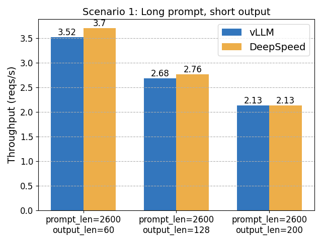 因此,當工作負載始終為長提示和短輸出時,DeepSpeed-FastGen 表現更佳。在其他場景中,vLLM 顯示出卓越的效能。