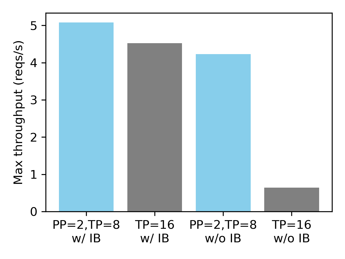 我們觀察到,當節點未透過 Infiniband 連線時,流水線並行至關重要。與 16 路張量並行相比,將 2 路流水線並行與 8 路張量並行相結合可帶來 6.6 倍的效能提升。另一方面,對於 Infiniband,兩種配置的效能相似。