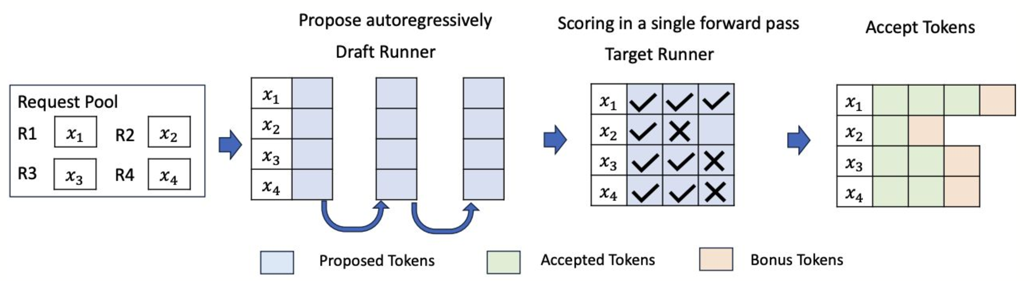 - 排程器:調整了排程器以處理單個前向傳遞中的多個令牌槽,從而實現同時生成和驗證多個令牌。