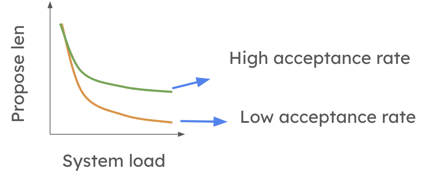為了克服投機解碼在高 QPS 設定中的侷限性,vLLM 正在努力實現動態投機解碼。請隨時檢視論文以獲取更多詳細資訊。這也是 vllm 中活躍的研究方向之一!此功能將允許 vLLM 根據系統負載和草稿模型的準確性來調整投機令牌的數量。在較高層面,當系統負載較高時,動態投機解碼會縮短提議的長度。然而,如下圖所示,當平均令牌接受率較高時,這種減少不太明顯。