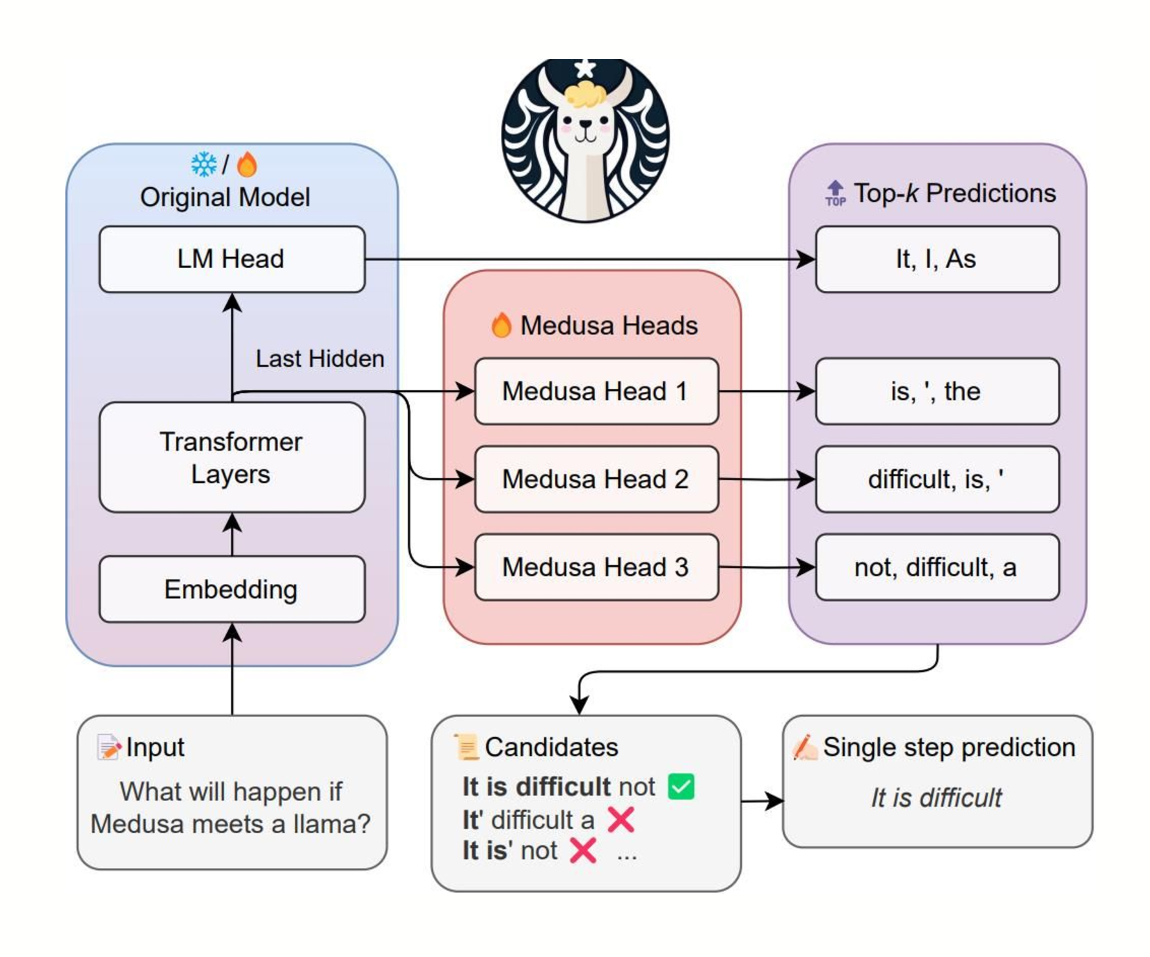 圖片來自 https://github.com/FasterDecoding/Medusa。在該示例中,使用三個頭來為以下三個位置提議令牌。頭 1 為第一個位置提議 ["is", "\'", "the"]。頭 2 為第二個位置提議 ["difficult", "is", "\'"]。頭 3 為第三個位置提議 ["not", "difficult", "a"]。所有頭都將最後一個 Transformer 塊的輸出作為輸入。