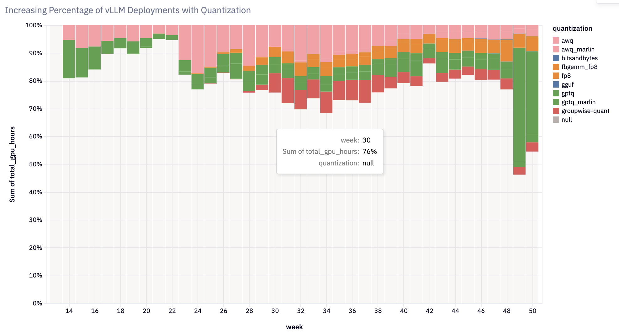- 權重和啟用量化:增加了對多種量化方法和核心的支援,從而在各種硬體平臺上實現高效推理。 值得注意的整合包括 FP8+INT8 的啟用量化、用於 GPTQ/AWQ/wNa16 的 Marlin+Machete 核心、FP8 KV 快取、AQLM、QQQ、HQQ、bitsandbytes 和 GGUF。 現在超過 20% 的 vLLM 部署使用量化。